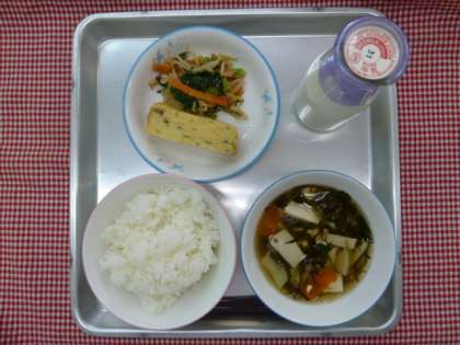 ごはん・八杯汁・愛知の五目厚焼き卵・小松菜のごまあえ・牛乳でした。