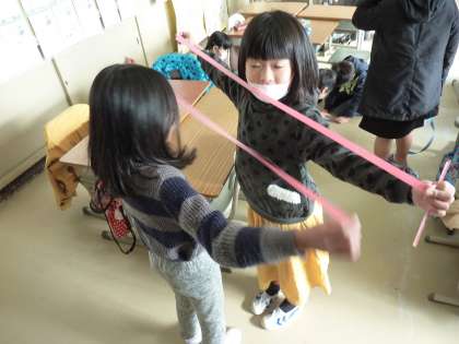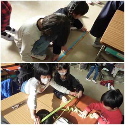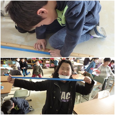 1mのものさしを使って、友だちと協力しながら活動しています。