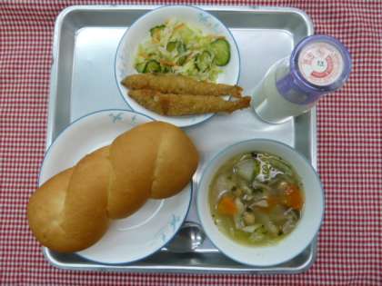 ツイストロールパン・ポトフ・ししゃもフライ・ミニフレンチサラダ・牛乳でした。
