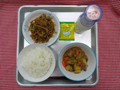 ごはん・肉じゃが・きんぴらごぼう・牛乳・ふりかけでした。