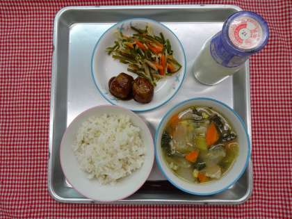 麦ごはん・中華スープ・肉団子・くきわかめのあえもの・牛乳でした。