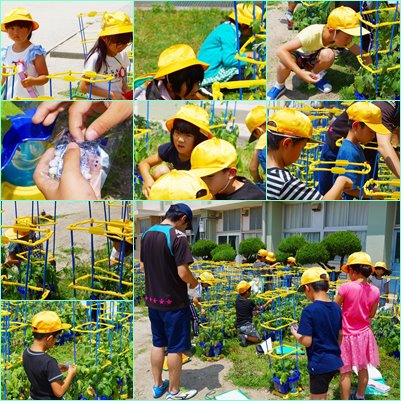 1年生が朝顔の観察に出てきました。今日は、肥料もあげるそうです。