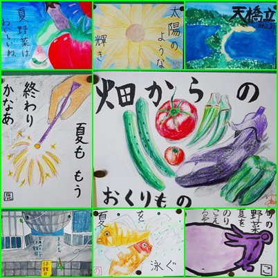 たくさんの夏休みの作品が教室や廊下に展示されています。今日は、6年生の絵手紙を紹介します。