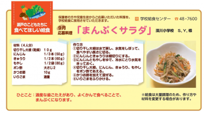 まんぷくサラダは、応募献立です。広報せと9月15日号に作り方が掲載されています。