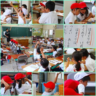 教科書に書かれた情報を皆で確認しあいながら正確に読みとっていました。なぜか、帽子をかぶっていました。運動会練習のすぐ後に、息つく間もなく勉強し始めたのかな?