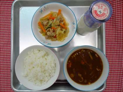 ごはん・具だくさんみそ汁・鶏肉とキャベツの炒め物・牛乳でした。