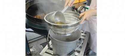 給食のみそ汁は、かつお節の厚削りからだしをとっています。下の写真は、給食室でだしをとっている様子です。