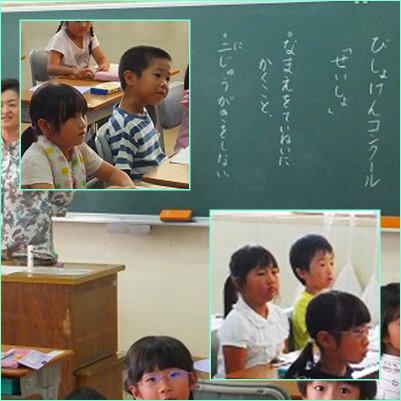 1年生が、尾書研コンクールの清書に取り掛かろうとしていました。よく注意を聞いて、美しい文字を書こうとがんばっていました。