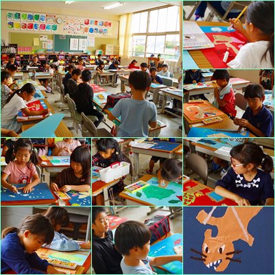 1年図工。 やぶいた紙から素敵な絵が出来上がっていました。水彩道具の使い方も上手になりました。
