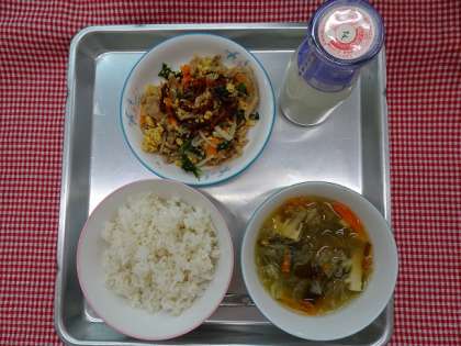 麦ごはん・わかめスープ・ビビンバ・牛乳でした。