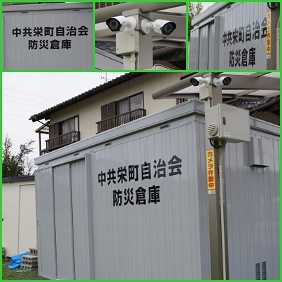先日、町内会長さんが学校に来られて、17日の防災訓練に向けて打ち合わせをしました。その際に、中共栄の自治会の防災倉庫が設置されたお話を聞き、見に行ってきました。以前お知らせした、防犯カメラのついた自販機がある場所です。