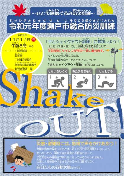 下のチラシのように、本日は瀬戸市内一斉に防災訓練が行われます。