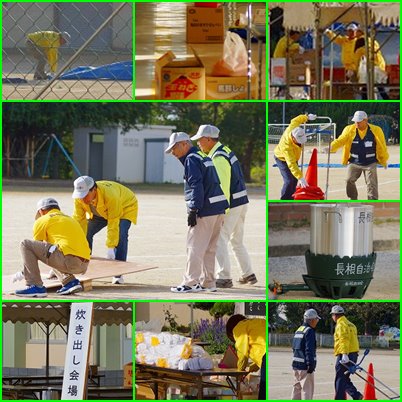 防災訓練の準備は、昨日の物品搬入、テントはり、ライン引きに続き、今朝7時から始まりました。開始に間に合わせようと皆さん一生懸命でした。