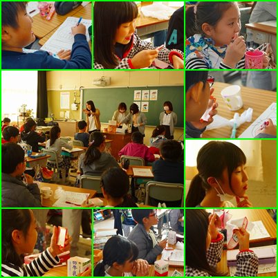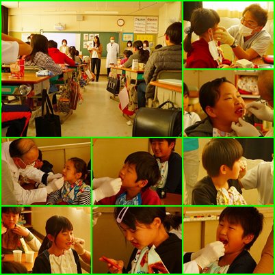 たくさんの大人が教室にやってきて、少し緊張しましたが、すぐに優しい人たちだとわかり、表情が和らぎました。染め出し液をぬってもらい、鏡で自分の歯の状態を確かめます。