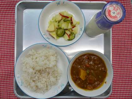 麦ごはん・カレー・キャベツとりんごのサラダ・牛乳でした。
