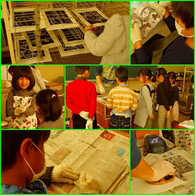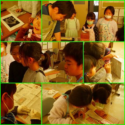 版画の「刷り」に取り掛かりました。ちょっとしたインクの濃さ加減をするのは1年生には難しいので、教員の頑張りどころになります。汗をふきふき、ローラーを回していました。