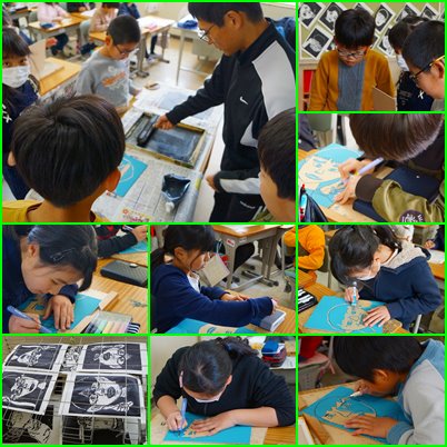 木版画 公開日 2020/01/16 更新日 2020/01/16 学校・学年ニュース 4年生図工。 彫りが完成した人から、刷りにかかります。インクを付けた途端、真黒な世界が目の、前に広がって、「おお〜」と声があがります。