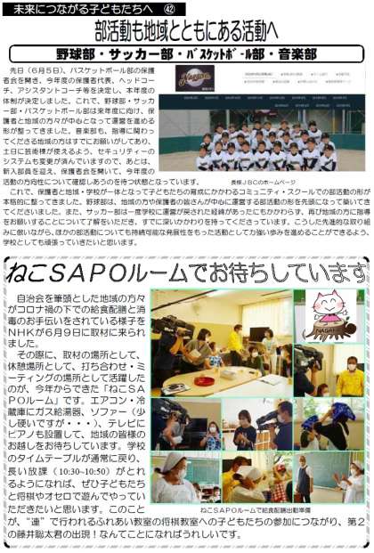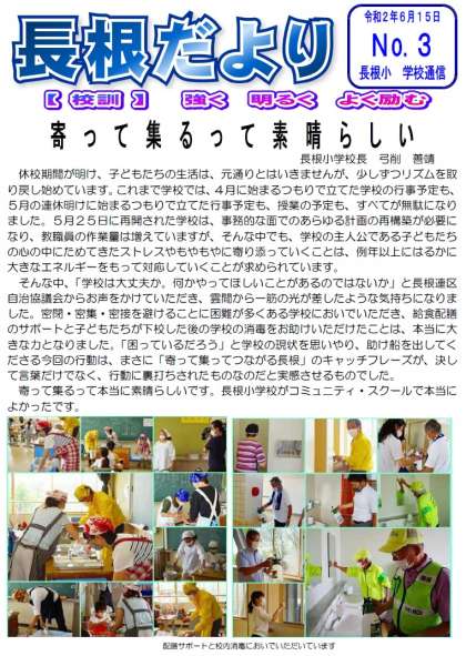 長根だよりの6月号を明日、お子様を通じて配付します。「寄って集る」を合言葉に、学校を助けに来てくださる地域の皆さんの姿は、NHKでも紹介されました。今回は、そのことについて書かせていただきました。
