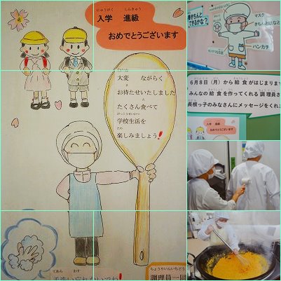 紹介が遅れまして申し訳ありません。給食の始まりに合わせて、調理員さんからのメッセージが職員室前にはってありました。いつも心を込めて、衛生にも細心の注意を払い子どもたちのために一生懸命調理されているお気持ちがよく伝わる絵と文でした。