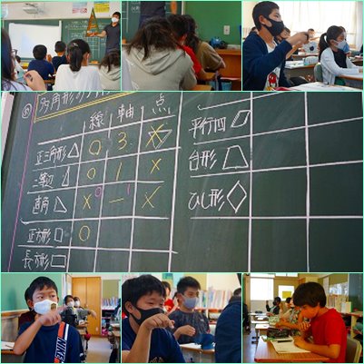 いろいろな三角形と四角形について、線対称・点対称の図形といえるのか一つ一つ吟味して調べていました。平行四辺形は、線対称に見えたようですが、実際の図形で対称の軸と思われる部分で折ってみると、そうでないことが実感できたようです。