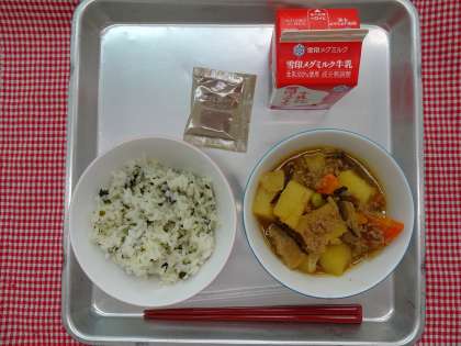 わかめごはん・じゃがいものそぼろ煮・ココア牛乳のもと・牛乳でした。