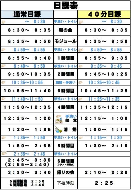 日課を変更しました。 公開日 2020/10/07 更新日 2020/10/07 学校・学年ニュース 10月に入り、熱中症の心配も以前ほどではなくなり、また、子どもたちの手洗いの習慣もついてきたことから、お昼の休み時間も外で遊ぶことができるように日課表を変更しました。 引き続き、換気・手洗い・消毒をすすめながら、感染防止に心がけたいと思います。