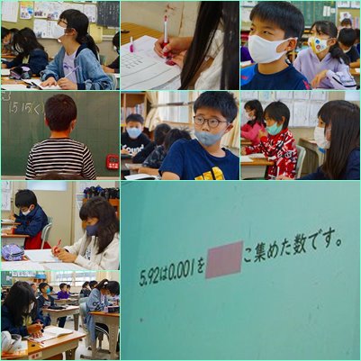先日小数の基礎的な部分を勉強していたと思ったら、今日はすっかり内容をよく理解して、まとめにかかっていました。ノートにまとめが書けた人は、スクリーンに次々映し出される問題に答えていました。問題のペースは結構早いのですが、さっと答えることができていました。