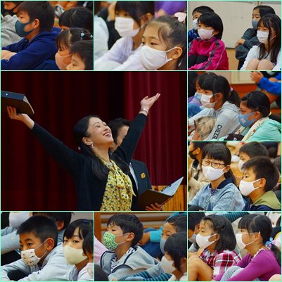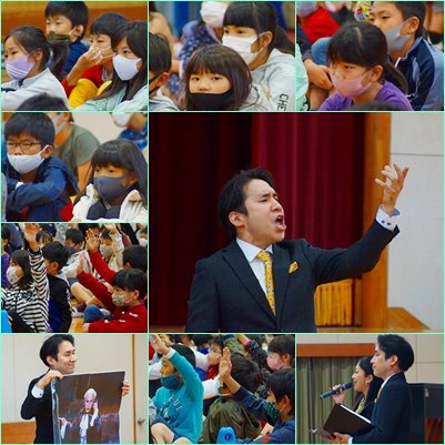10月29日に行われる芸術鑑賞会に向けて、歌手(お二人)と伴奏者の方(びわ湖声楽アンサンブル)においでいただき、ワークショップを開いていただきました。身近で声楽を聴く機会はなかなかないこともあり、子どもたちは歌が始まったとたん、「おおっ」という表情になりました。