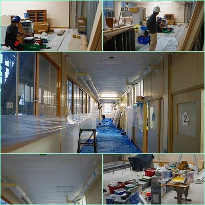今日は、2階の廊下の天井の塗装と家庭科室の工事の様子を見に行きました。廊下の塗装は、当然ペンキの臭いが立ち込めますので、平日にはできません。きちんと掲示物に養生をして、丁寧に仕事をしておられました。家庭科室は、まだ廊下と教室のパーテーションが届いていませんが、電気がLEDにかわり、とても明るくなっていました。