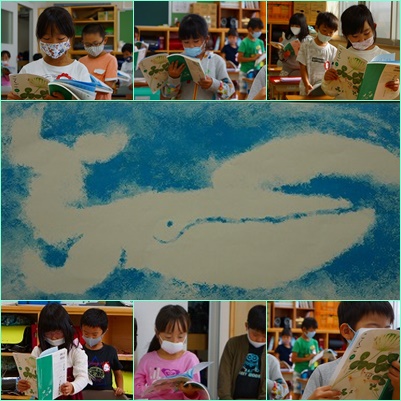 1年生で読み終えるのにしっかりと時間のかかる初めての物語文が「くじらぐも」です。地の文と会話の文の違いに気づいて読むこと、挿絵とストーリーを重ねてイメージを深めることなど、いろいろな課題がありそうですが、まずは音読。正確にストーリーをつかむために、皆で何度も何度も音読に取り組みます。3年生の「ちいちゃんの・・・」でもそうでしたが、まず物語の展開をきちんとつかむことを繰り返しの音読によって行っていきます。