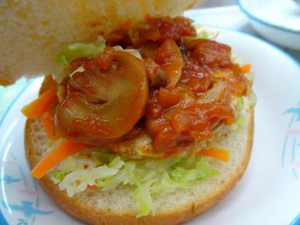 サンドイッチバンズパンは切れ込みがあり、ハンバーグのきのこソースかけと彩りキャベツをはさんでハンバーガーのようにして食べました。