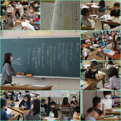 2年生の国語の授業では、どんなことを話せばいいのか例をもとに、学習しました。先生の「さあ、どうぞ」の声とともに、一斉にグループでの話し合いが始まりました。きっと、あれを話そう、これを話そうと考えていたのですね。聴く子の真剣な聴き方がまたいいですね。手を挙げて発言することも身についています。