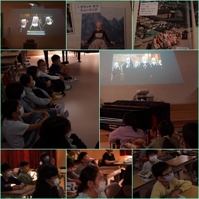今日の音楽室は映画館でした。4年生の音楽で学習しているサウンドオブミュージックの映画をかいつまんで鑑賞していました。教科書の写真だけでは、わからないストーリーがみれて、歌の背景や情景がとてもよくわかりましたね。教会で学んでいた音楽好きなマリアさんが家庭教師になるきっかけも興味深かったです。