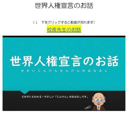 人権週間にちなみ、子どもたちに見てもらうための動画を作成しました。配付文書にリンクを貼り付けました。良かったらご覧ください。IDとPWはいつもと同じです。