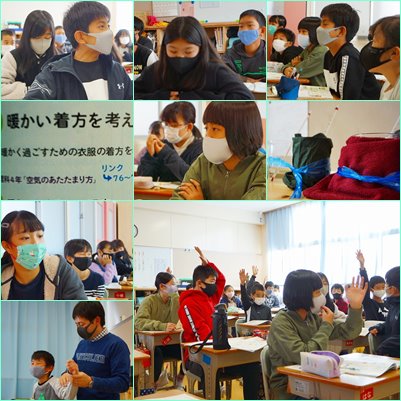 暖房器具に頼らず、衣服の着方を工夫することで暖かく生活する工夫について考えていました。ビーカーにお湯を入れ、違った素材でくるんで温度変化を調べてみたり、重ね着をする意味について議論してみたりしました。もしかしたら、明日からの服装に工夫がみられるようになるかもしれません。