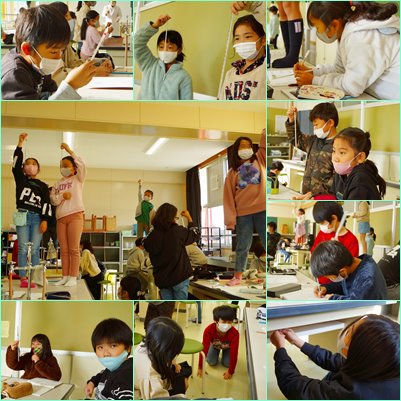 理科室で温度計を持った子どもたちが、いろいろなスタイルで温度計を見つめていました。空気の温度を計っていたのだそうです。上の方と下の方の温度の違いは無事確認できたでしょうか。