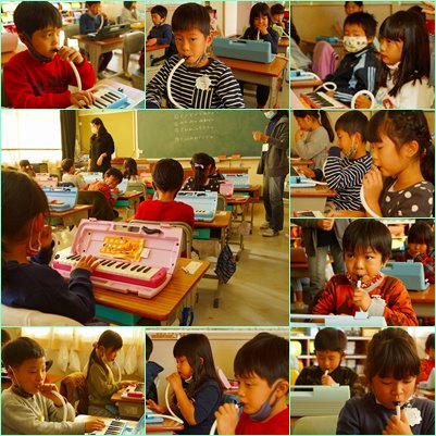 鍵盤ハーモニカを弾いていました。手をみかんの形にして、黒板の楽譜を見ながら全員でユニゾンで演奏していました。よく聴きあえるようになってきたからでしょうか、よくそろっていました。