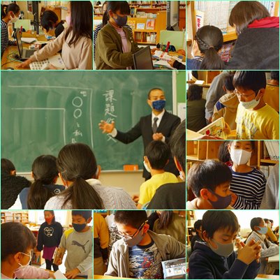 「○○と私」というテーマで、伝記を読んで作文を書きます。まず、説明を聞いてから、図書室へ行って本を選びました。図書委員の二人がてきぱきと貸出作業をしていました。