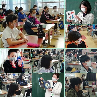 換気のため教室はエアコンとヒーターで温めていますが少し寒いです。そんな環境ですが、葉っぱの会の皆さんの熱のこもった読み聞かせで子どもたちはいつもの集中した表情を見せていました。