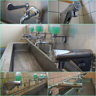 廊下にある手洗い場の水栓が、レバー式のものと自動水栓に交換されました。大規模改修とコロナ対策の予算を合わせる形で、子どもたちの手洗いが少しでも効率的で清潔な環境の下で行えるようにと考えました。すべてを自動水栓に交換することは、費用上できませんでしたが、自動水栓はもちろんのこと、レバー式の水栓でも従来のものに比べ、水栓に触れる時間が短くなりました。