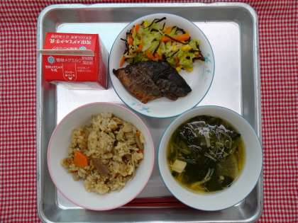 五目ごはん・牛乳・ほうれんそうのすまし汁・ぶり三河みりん焼き・キャベツの昆布あえでした。