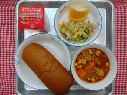 黒ロールパン・牛乳・チキンビーンズ・フレンチサラダ・いよかんでした。