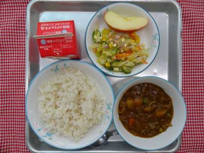 麦ごはん・牛乳・愛知県産牛肉のカレー・イタリアンサラダ・りんごでした。