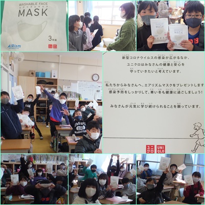 今日、全員にマスクが配られました。「エアリズムマスクがもらえるなんて信じられな〜い」と子どもたちも大喜びでした。教えてくださったPTA役員の方、ユニクロさん、本当にありがとうございました。大切に使わせていただきます。