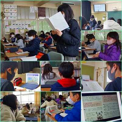 自分のタブレットをミラーリングして大型モニターに映し出し、自分の考えを発表していました。聞く方は、聞きやすい話し方になっていたかどうか、ノートに評価を書き入れていました。