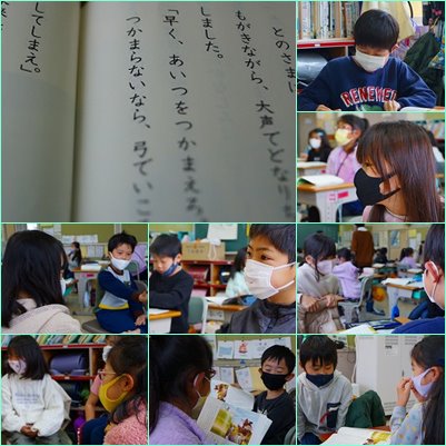 殿様のセリフ、「早く、あいつをつかまえろ! つかまらないなら、弓でいころしてしまえ!」は、どのような様子で言ったのか、皆で考えていました。心に刺さる恐ろしい言葉です。思わず耳を塞ぐ子がいました。その気持ち、よくわかります。