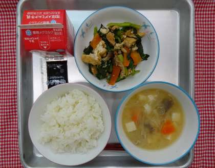 ごはん・牛乳・五目白みそ汁・小松菜と厚あげのおかか炒め・のりの佃煮でした。