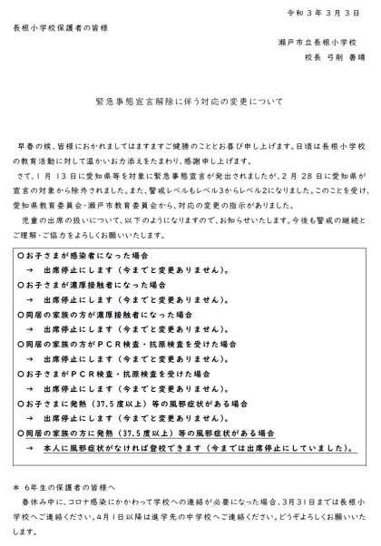 この度のレベル3からレベル2への変更に伴い、出席停止への対応が1部変更になりましたので、本日お子さまを通じましてお知らせを配付しました。こちらのHPの配付文書からもご覧いただけます。ご確認いただけますよう、お願いいたします。