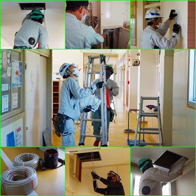 校内には経年劣化の進む様々な設備があります。水道管は、8割方交換が終わり、サビの混じった水は出なくなりました(夏休みに最後の交換工事が予定)。今日は、放送関係の配線の交換工事をしていただきました。