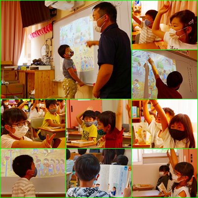 窓から教室に入る子の絵があり、「え〜っ!」と言っていました。長根小学校の1年生の教室は2階にありますから、そう思うのも当然です。